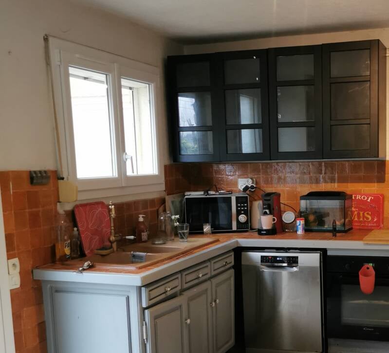 Pour le reste, j'ai simplement repeint la crédence orange de la cuisine avec une peinture spéciale adaptée aux cuisines. Quant à l'évier marron, je l'ai recouvert de résine en deux applications, sans nécessiter de sous-couche pour l'un ou l'autre.